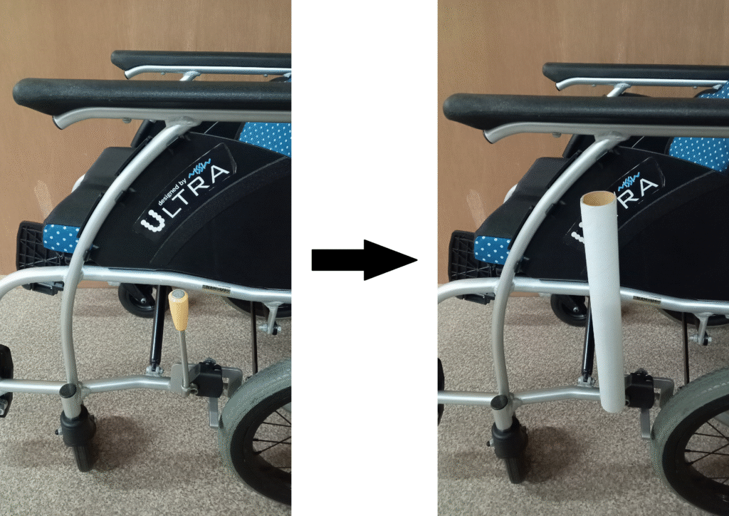 車椅子は自宅内だけで使うので見栄えは特に気にしないという方は、サランラップの芯をブレーキレバーに挿し込んで使用するのもひとつの方法です。