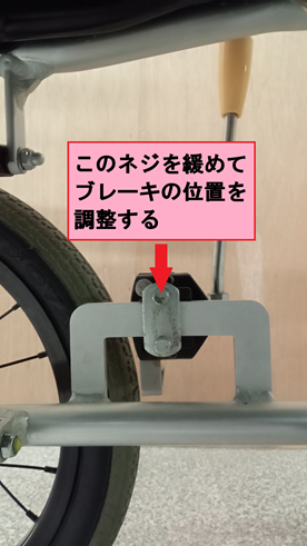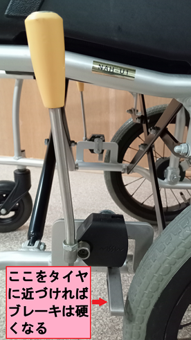 車椅子の駐車ブレーキはブレーキを掛ける時の硬さを調節できるように駐車ブレーキ部分の位置を調整できるようになっています。