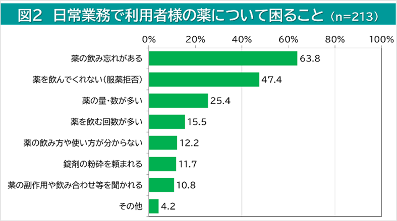一般社団法人 くすりの適正使用協議会によるホームヘルパー約400名を対象としたアンケート調査の結果、日常の業務で利用者の薬に関する困りごとでは「薬の飲み忘れ」は1位でした。