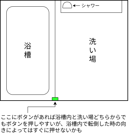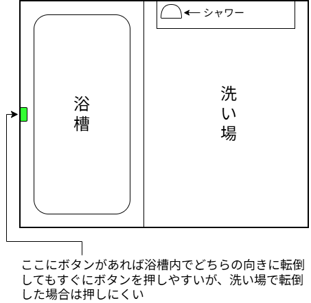 浴槽内で何かあった時の為にと送信機を浴槽側の壁に付けたけど、洗い場で転倒して動けなくなってしまいボタンを押せなかった時。また逆のパターンもあるかもしれません。