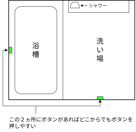 こうなることが心配な方は、呼び出しボタンが洗い場側と浴槽側にそれぞれ1個ずつあると安心。