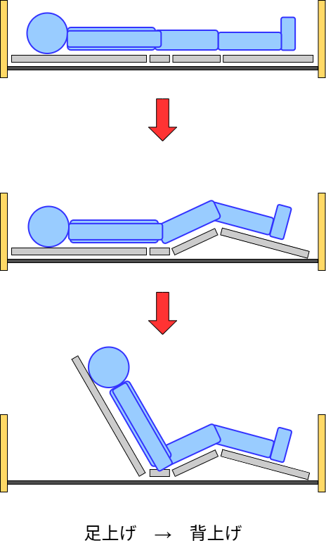 ②3モーターベッド(背上げ機能・ベッド全体の高さ調整機能・足上げ機能がある)の場合は背上げをする前に先に足上げを活用する